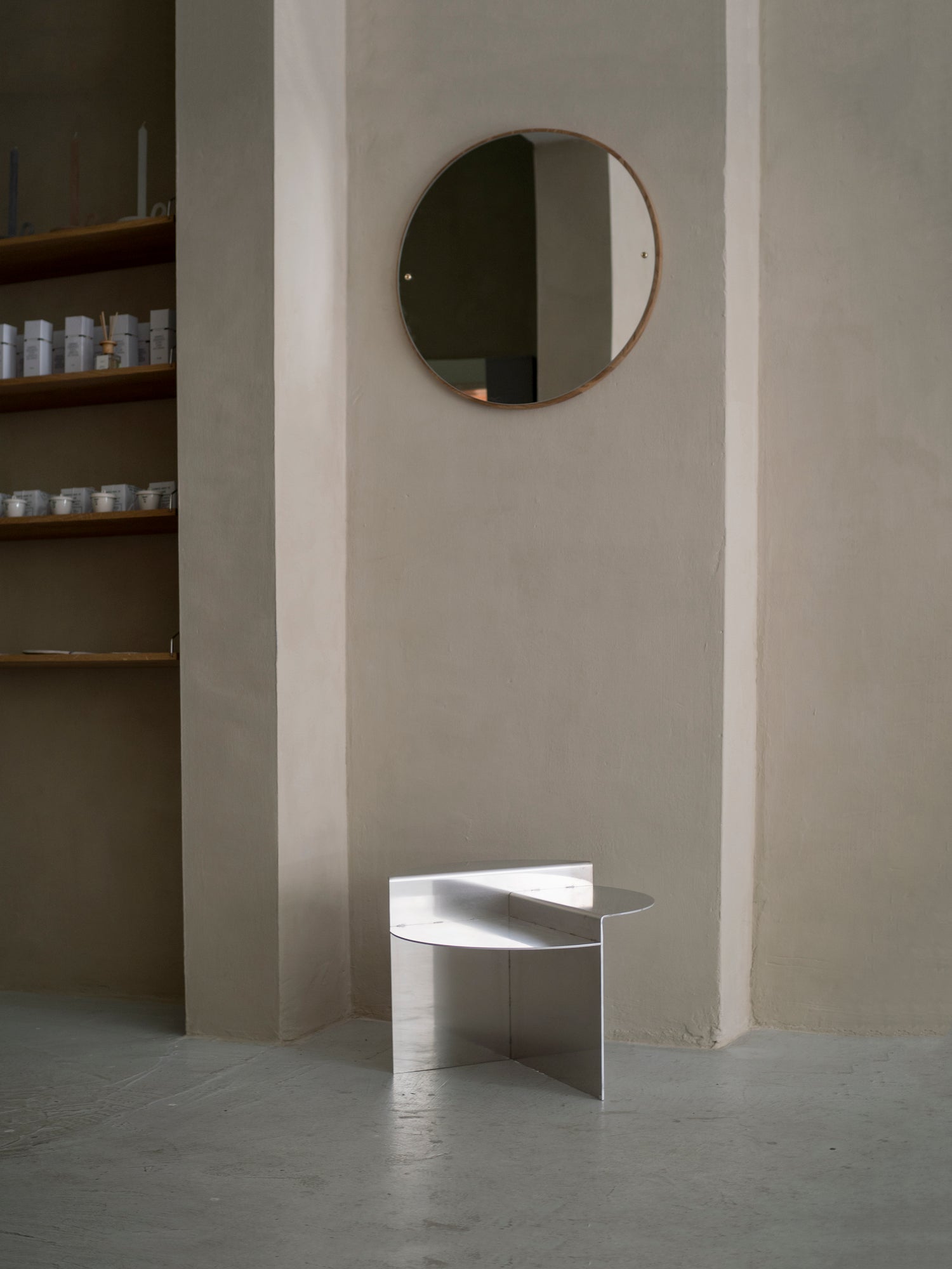The Rivet Side Table is a versatile furniture piece that adapts gracefully to any space. Its round tabletop is uniquely partitioned into three distinct levels, resulting in a dynamic, multi-tiered surface that adds interest and functionality. Like other pieces from the Rivet line, the side table is constructed through a specialized riveting technique. This technique forms sturdy, perpendicular joints between separate, laser-cut raw aluminum sheets, producing a strong structure and an industrial aesthetic.