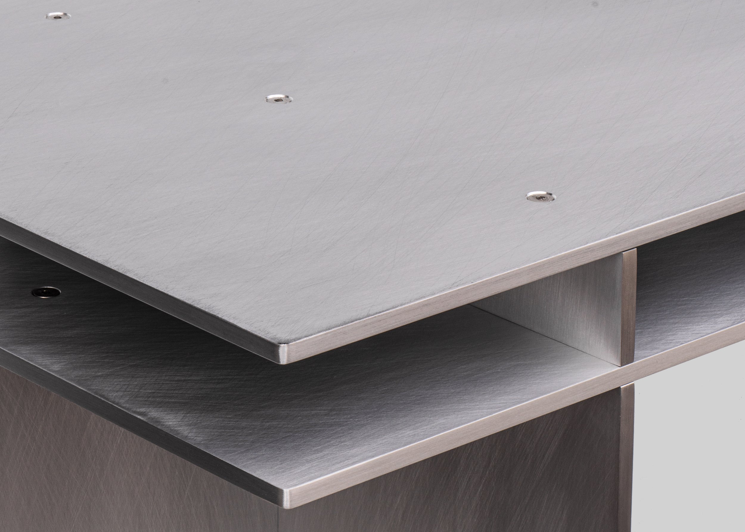 Crafted from a solid aluminum sheet of 1.5x3 meters, the design maximizes the use of the material, leaving minimal waste. The 12mm thickness ensures clean, precise lines, featuring a dual-layered tabletop that adds a unique depth to its profile. This layered design not only serves a visual purpose but also provide practical utility, concealing storage or cable management for those who desire a minimalist workspace. The metal legs, finished with a brushed technique, further enhance its contemporary appeal. Their geometric simplicity complements the tabletop, creating a harmonious blend of form and function.