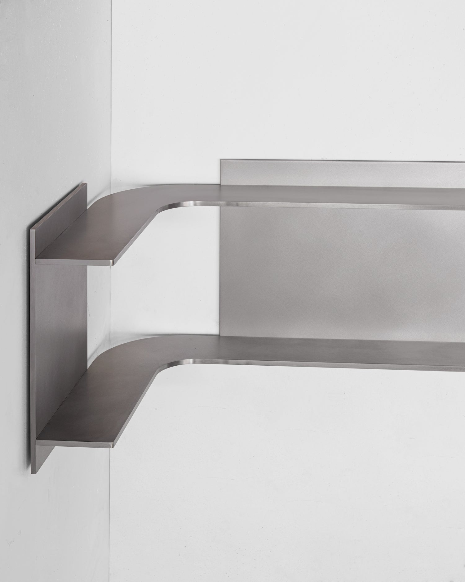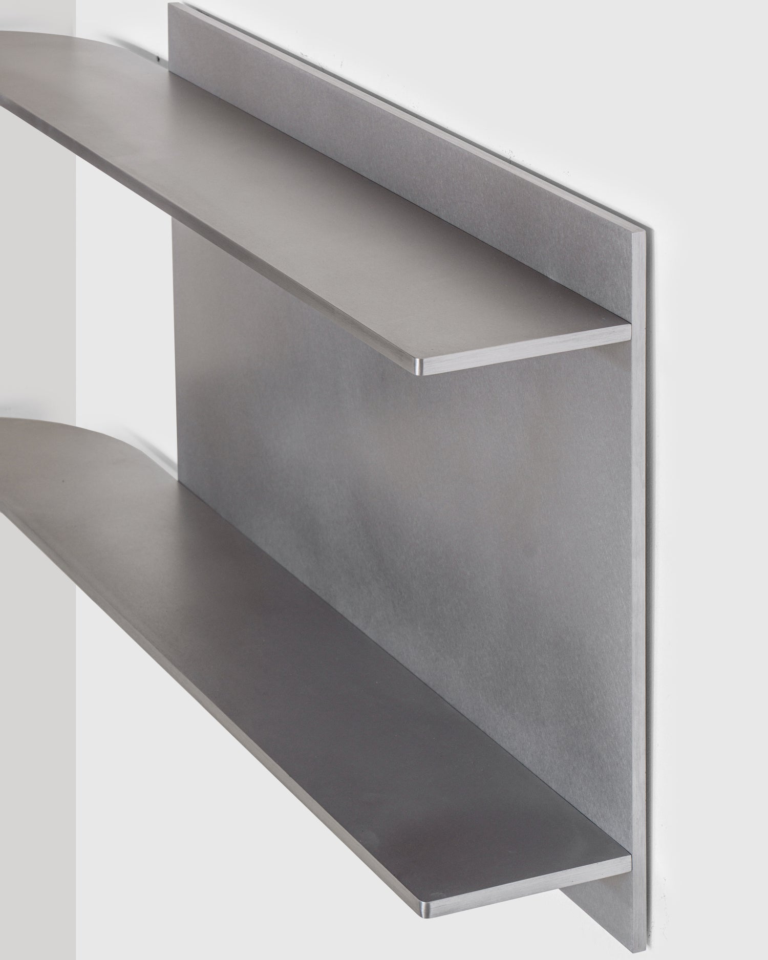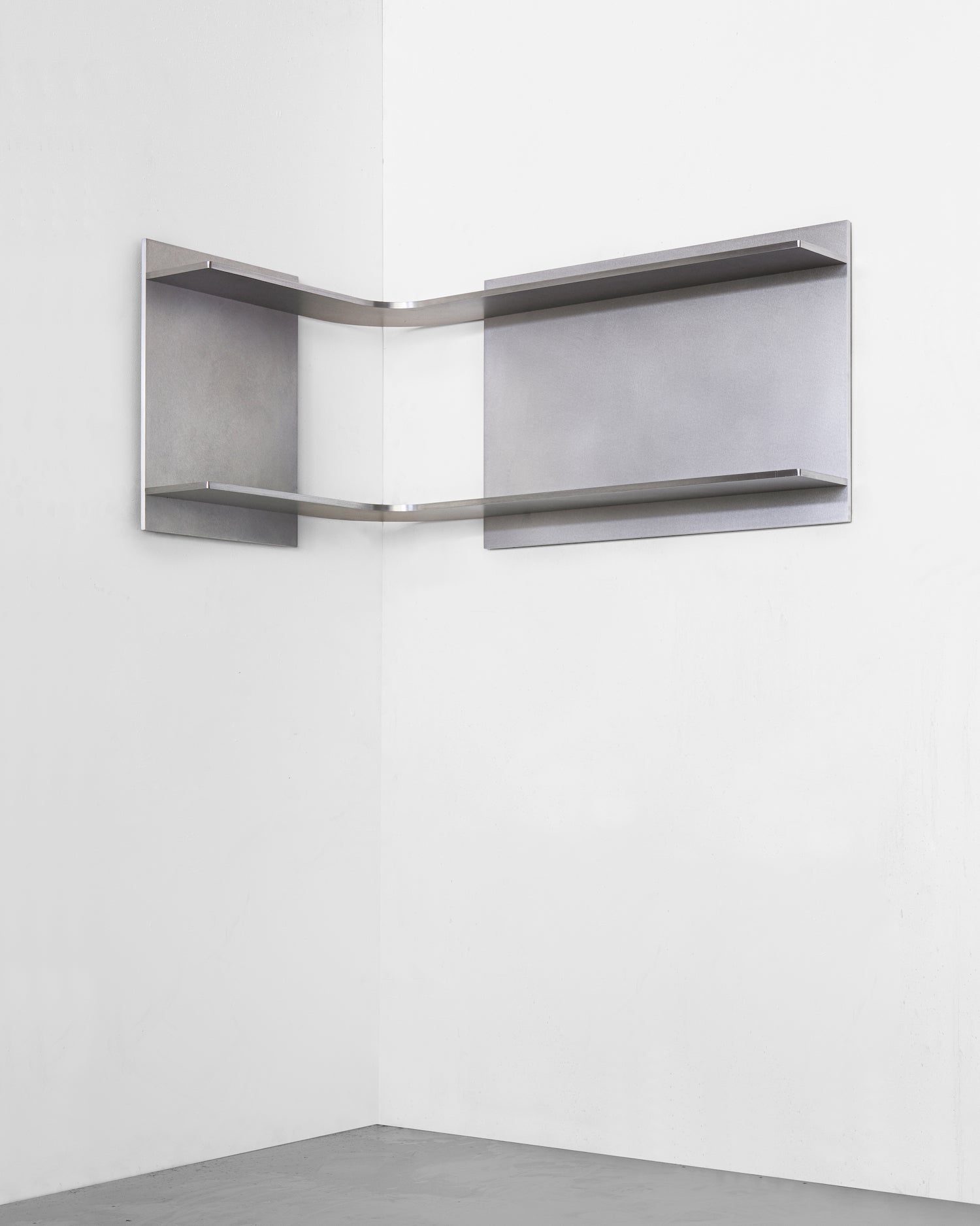 Angle Shelf is a minimal shelf designed by Rotterdam-based designer Johan Viladrich. The privately commissioned piece is constructed of waxed aluminum and connects to the wall at a 90 degree angle. The angle is formed through the curvature of the shelf surfaces, which are then connected to the plates attached to the wall.