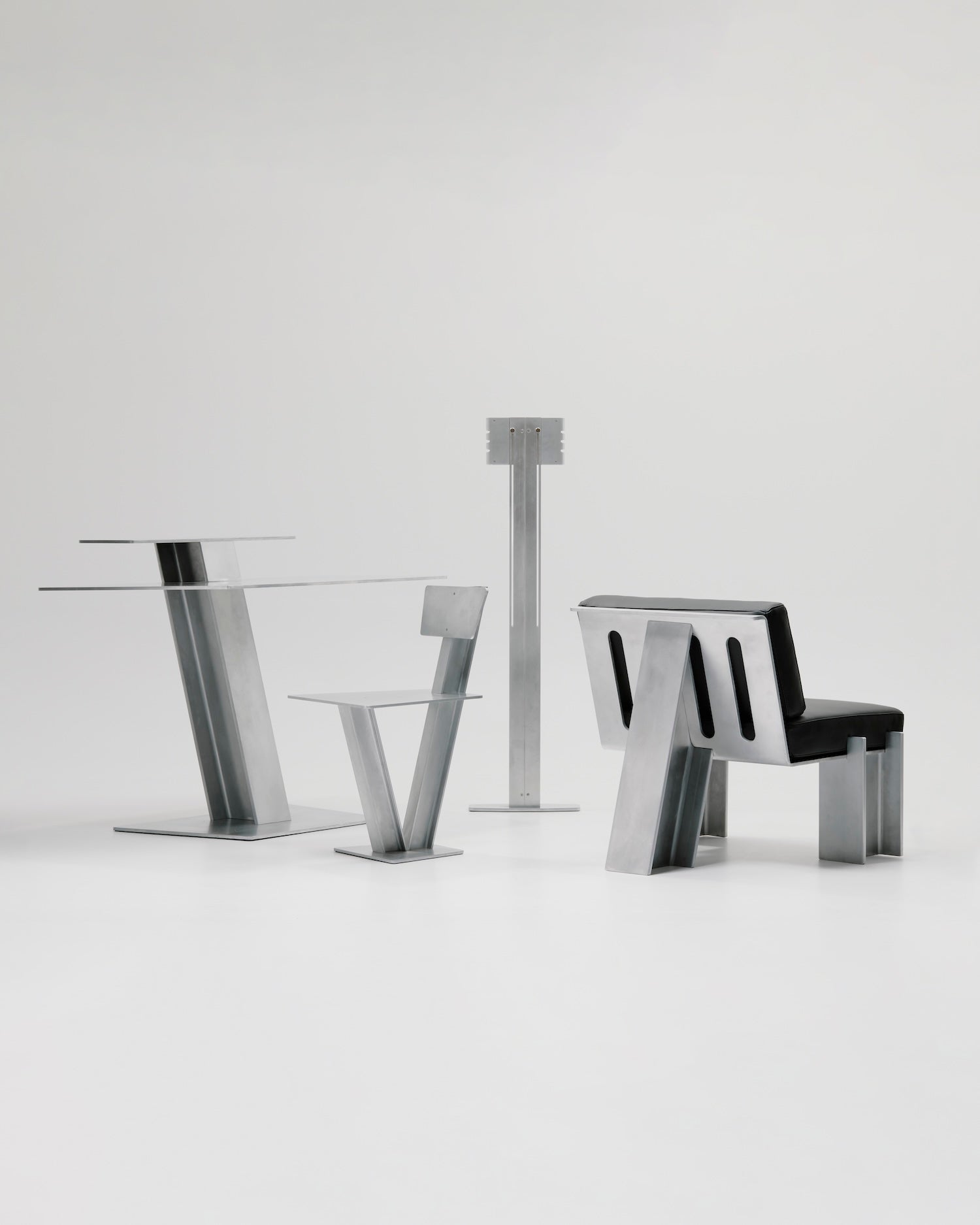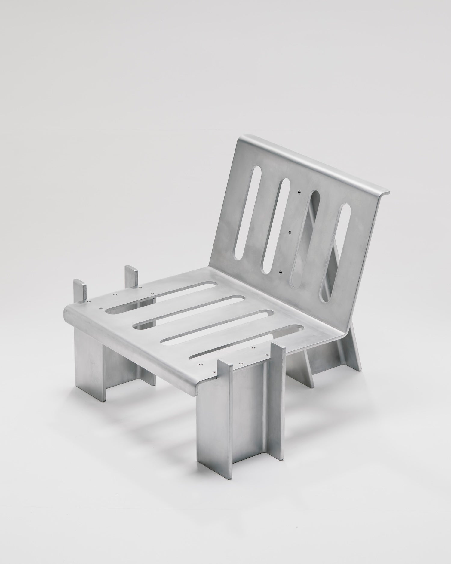 Beams is inspired by the use of structural supports in architectural buildings, further contextualized within the structures they inhabit. The Beam Chair features precisely angled I-beams and laser cut aluminum sheets. The surface is treated with a waxed finish, balancing a sense of rigid industrialism with utility. Edition of 10.