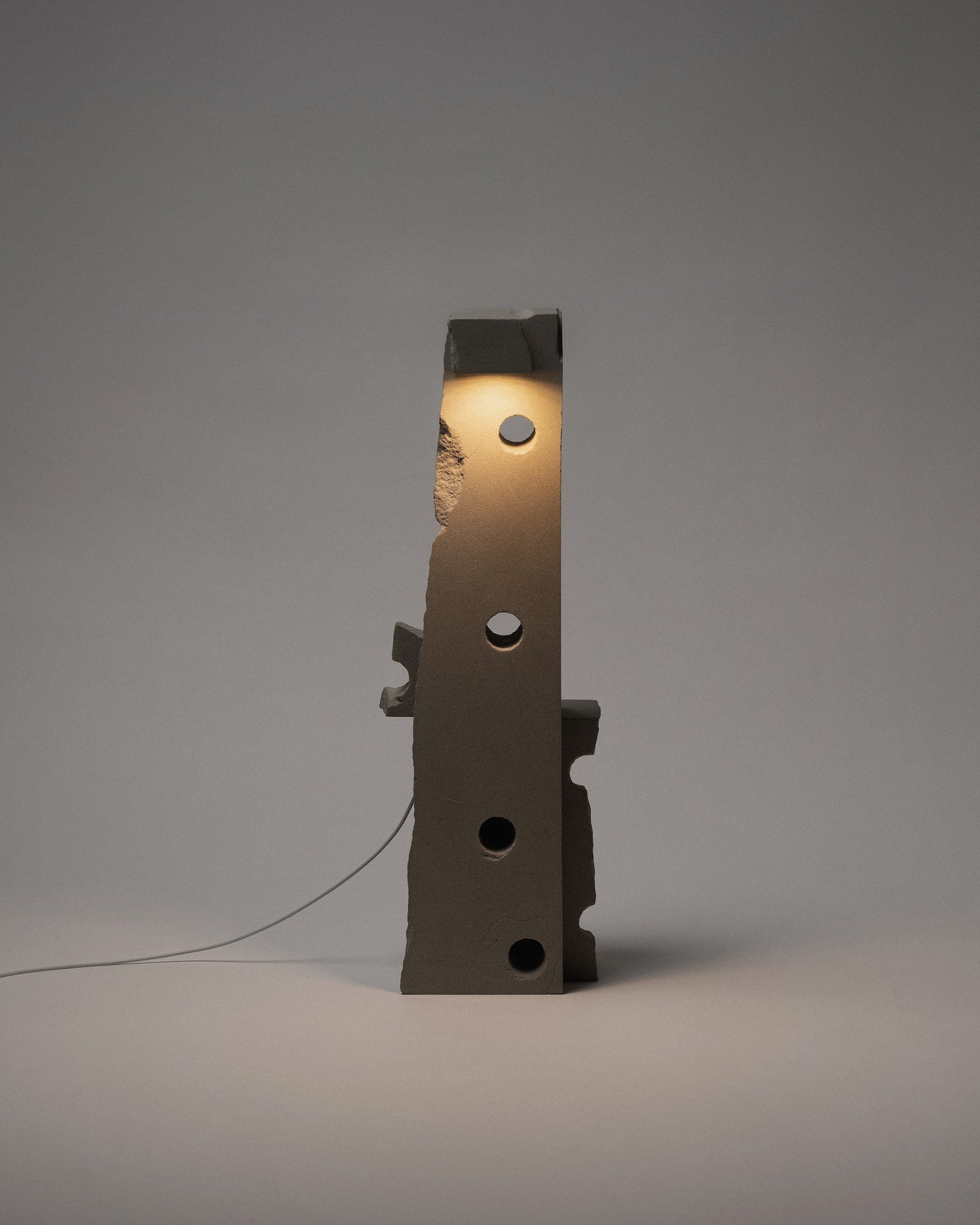 The Berea Sandstone Lamp 9 is one of eleven unique editions within an exclusive collection curated by HB-AS, presenting their singular sandstone lighting fixtures in collaboration with Leibal. Crafted by San Francisco-based designers Hank Beyer and Alex Sizemore, these lamps reflect their dedication to craftsmanship and innovative material usage, echoing Leibal's commitment to minimalist design. This collection showcases years of exploration and experimentation with sandstone, salvaging artifacts from both ancient and modern processes to create sculptural luminaires. Each lamp, a collage of minimally modified parts, celebrates the distinct origins of its sandstone piece, imbued with a history spanning 350 million years. From the fine details to the dynamic textures produced by industrial processes, each lamp tells a unique story of time and transformation.