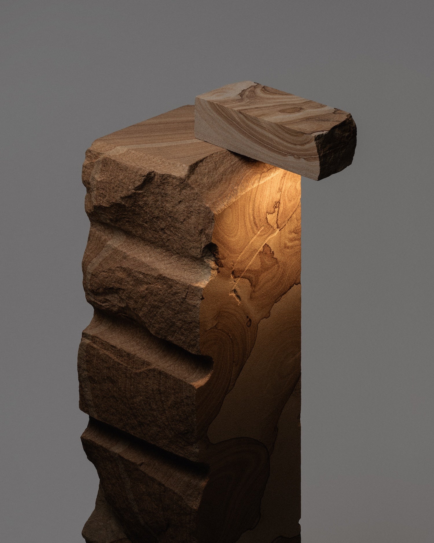 The Variegated Berea Sandstone Lamp 1 is one of eleven unique editions within an exclusive collection curated by HB-AS, presenting their singular sandstone lighting fixtures in collaboration with Leibal. Crafted by San Francisco-based designers Hank Beyer and Alex Sizemore, these lamps reflect their dedication to craftsmanship and innovative material usage, echoing Leibal's commitment to minimalist design. This collection showcases years of exploration and experimentation with sandstone, salvaging artifacts from both ancient and modern processes to create sculptural luminaires. Each lamp, a collage of minimally modified parts, celebrates the distinct origins of its sandstone piece, imbued with a history spanning 350 million years. From the fine details to the dynamic textures produced by industrial processes, each lamp tells a unique story of time and transformation.