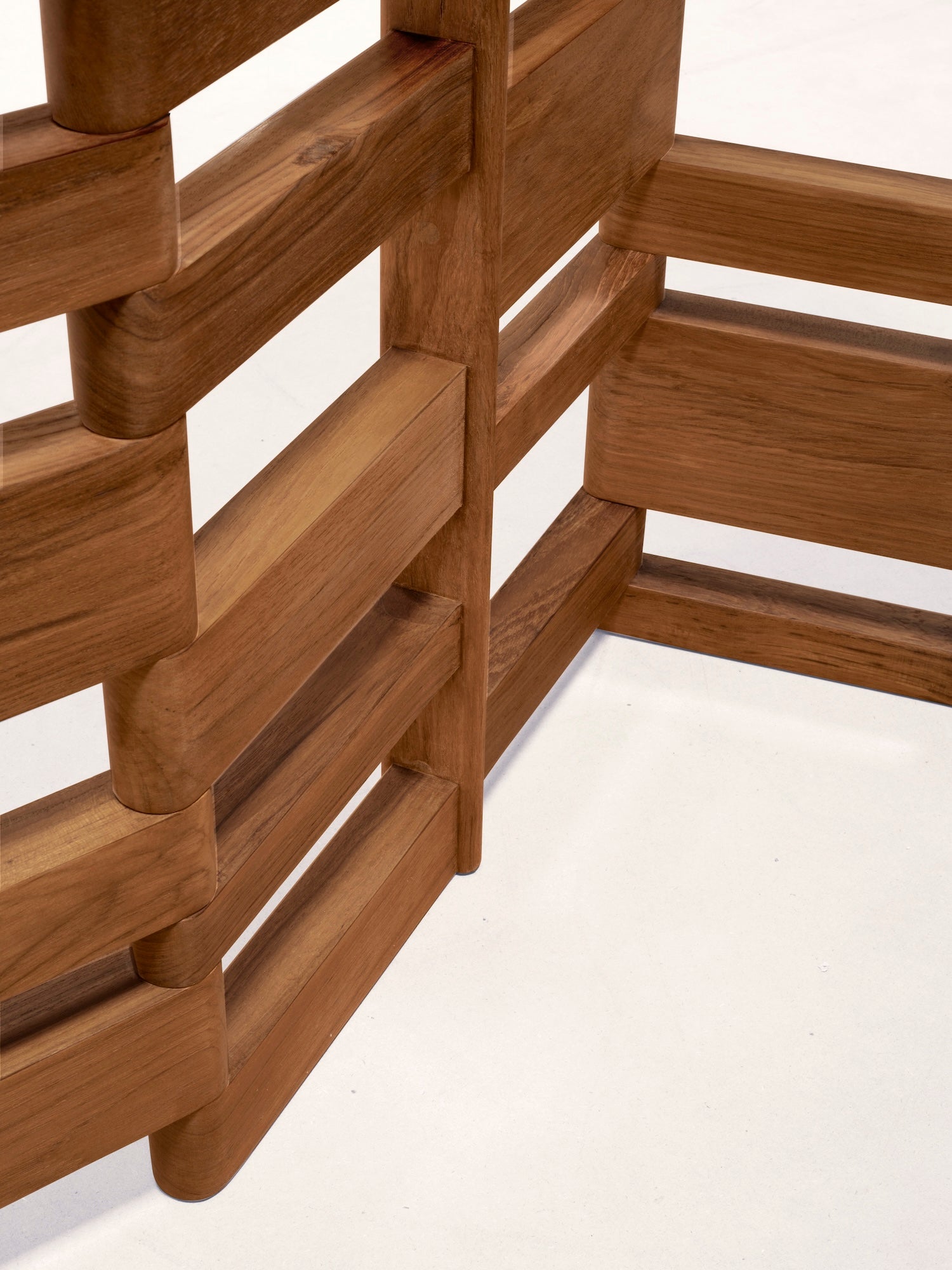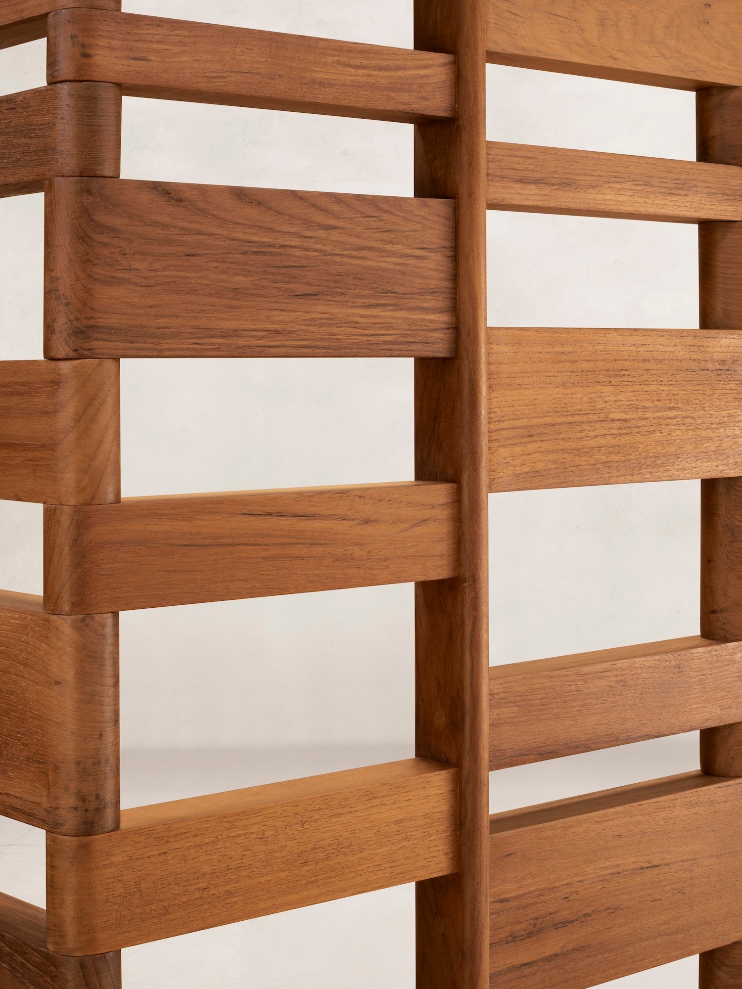 Each screen is singular in composition, with subtly varied block arrangements. Individually shaped and polished by hand before assembly, the process demands a high level of skill and craftsmanship. As a natural material, teak presents tonal variations, further ensuring that no two pieces are alike.